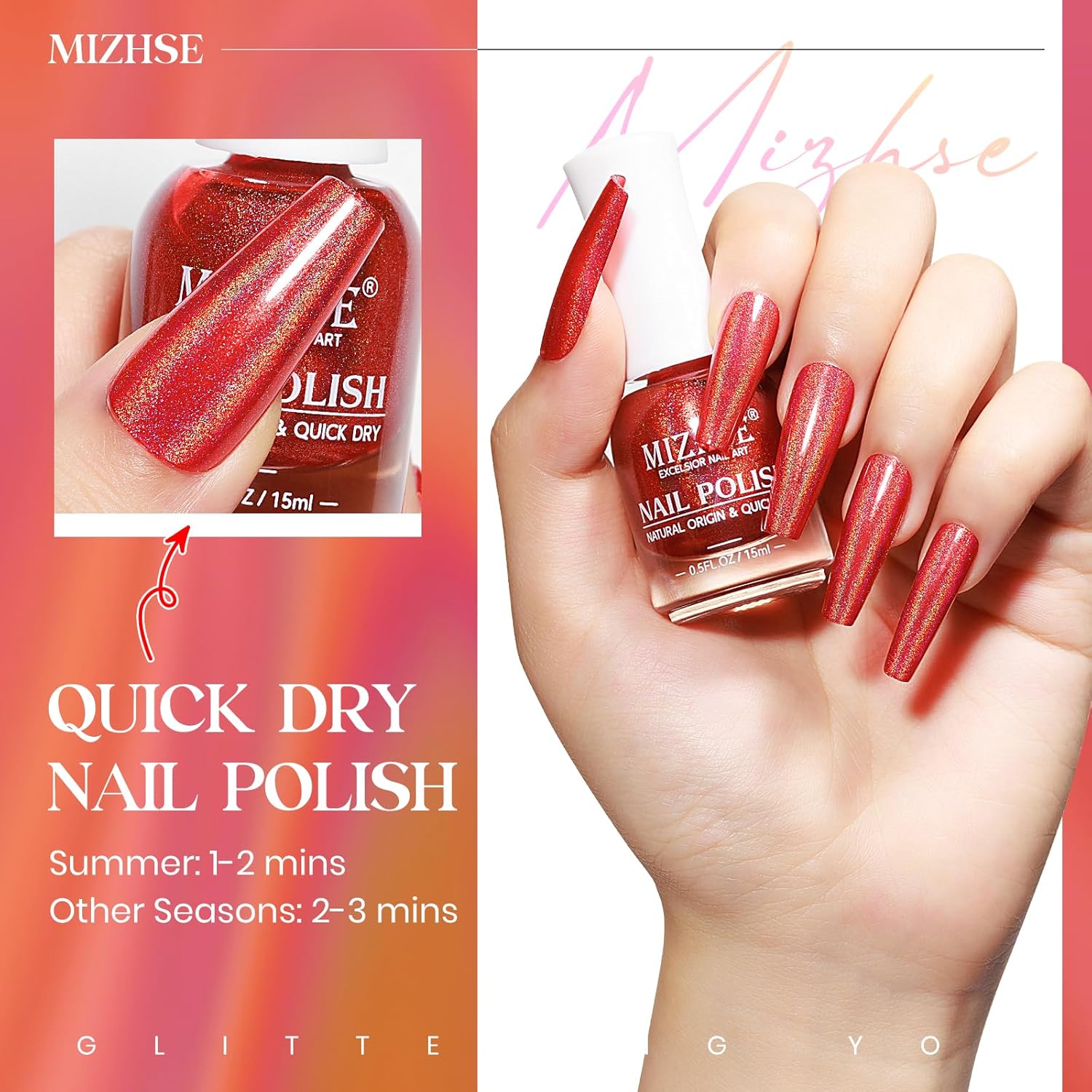 MIZHSE Holographic Nail Polish, Red Glitter Nail Polish Air Dry Fast, 15 ml 0.5 fl oz High Glossy Shiny Nail Pigment Oil-based Laser Iridescent Chrome Halo Nail Art Salon Manicure Home