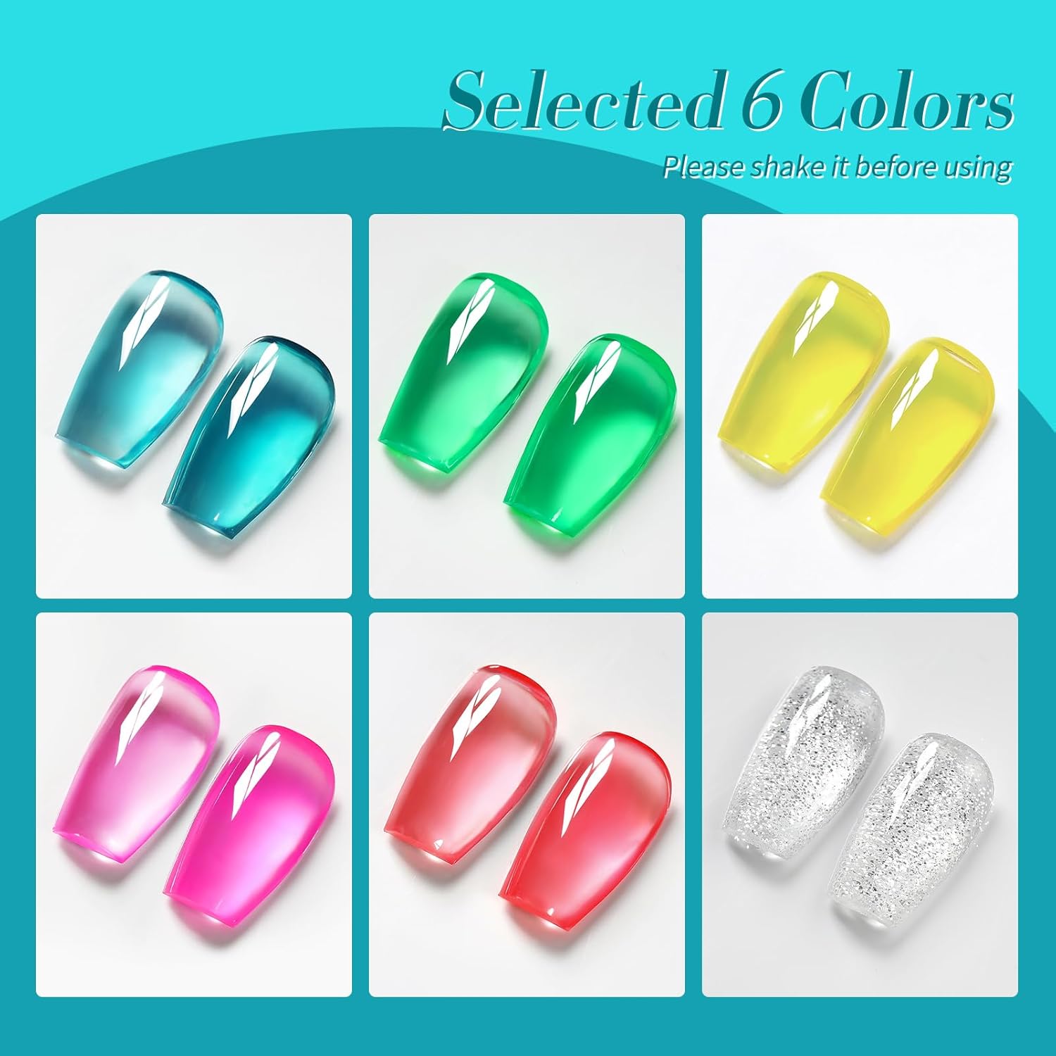 • PACKAGE CONTENTS: 5 Bottles neon jelly gel nail polish with 1pc silver platinum glitter gel polish.Include Blue Green Pink Red Yellow Silver Colors.A set of gel polish allows you to try multiple different effects.You can DIY various nail art styles.Use as regular color gel,blooming gel effect,gradient effect.