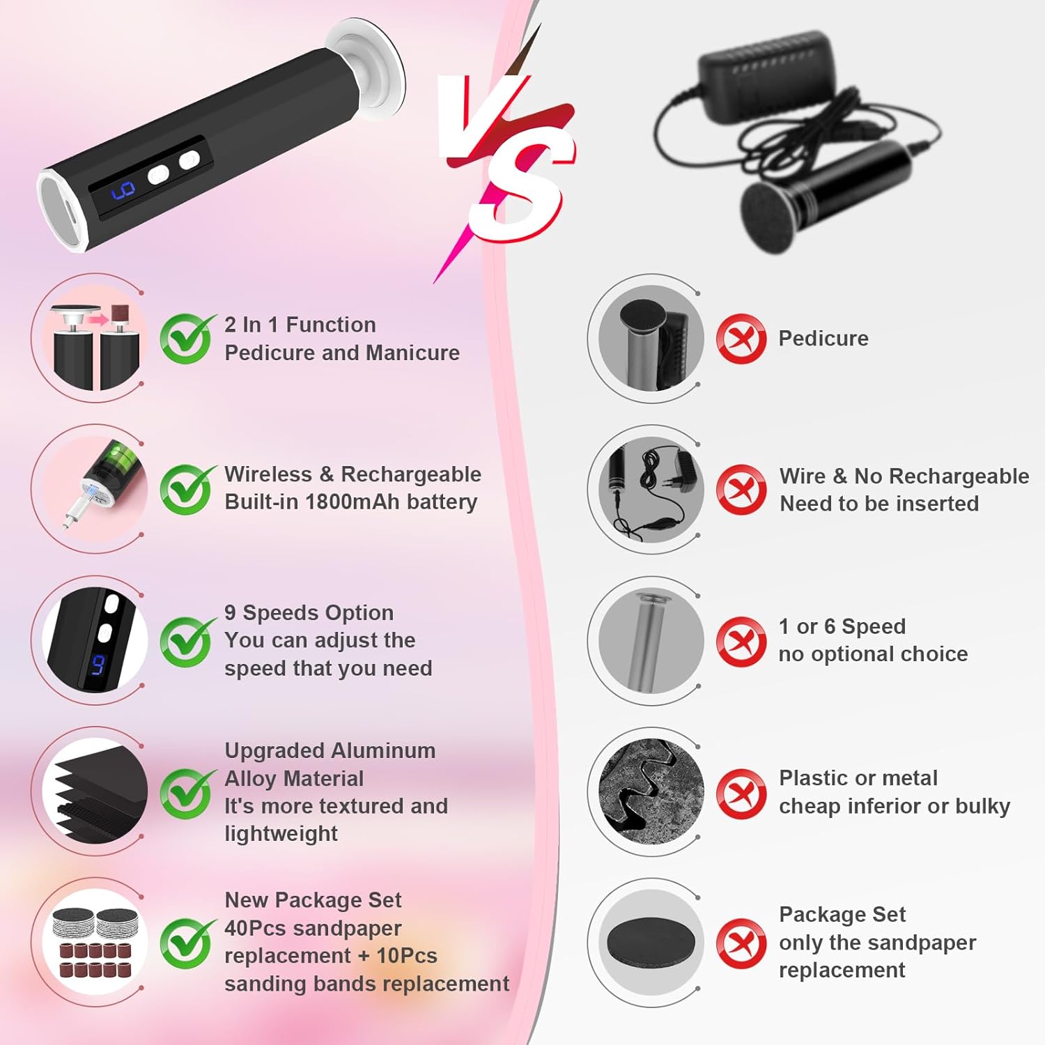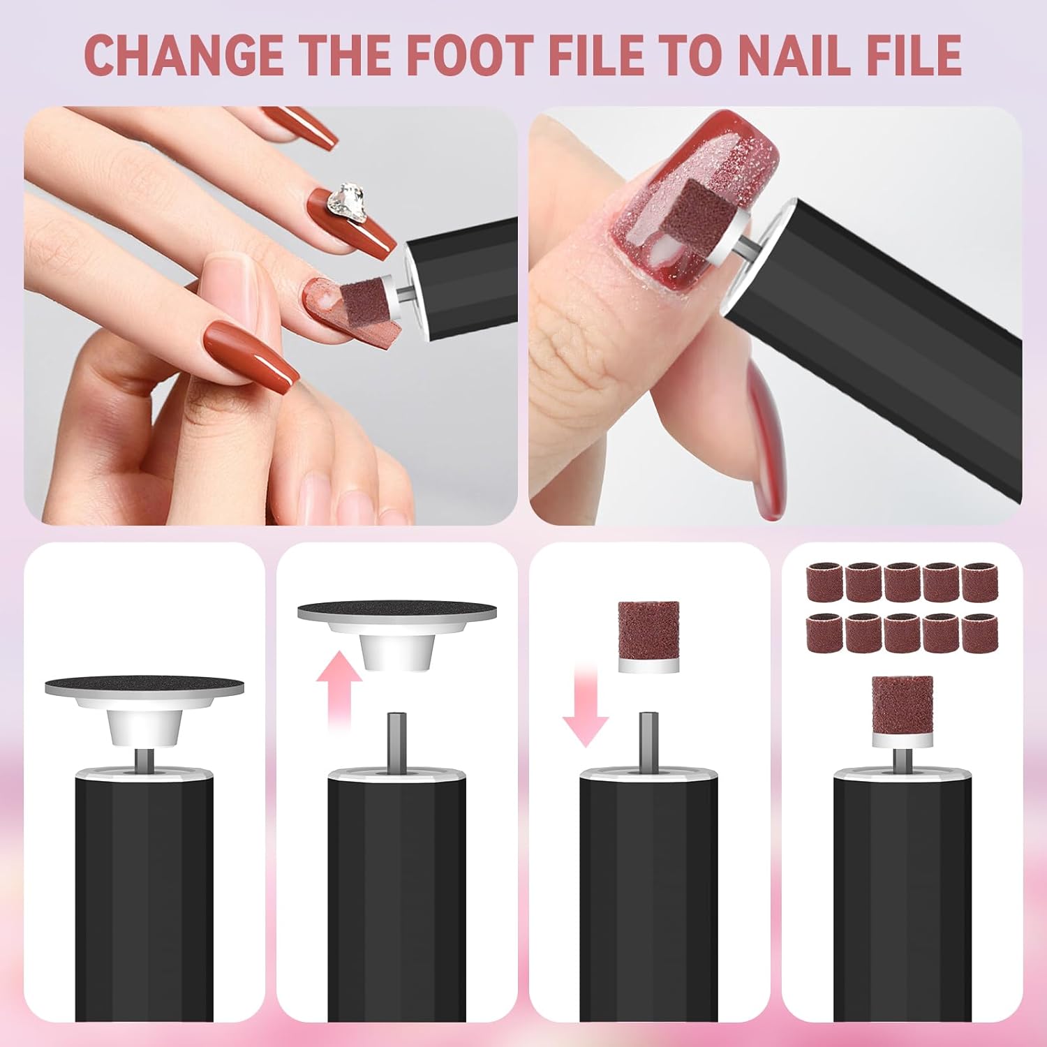 - 【WHY CHOOSE OUR LATEST FOOT SCRUBBER】More Convenient- this is 2-in-1 nail and foot scrubber, for both foot & hand care. More Gentle - compared to traditional foot grinding tools, it prevents over-grinding or bleeding, ensuring a safer experience! More Hygienic - one sandpaper for per person offering a more hygienic solution! More Efficient - Designed with the latest ergonomic features, this foot file offers adjustable speed settings and clockwise/counterclockwise rotation, making it faster