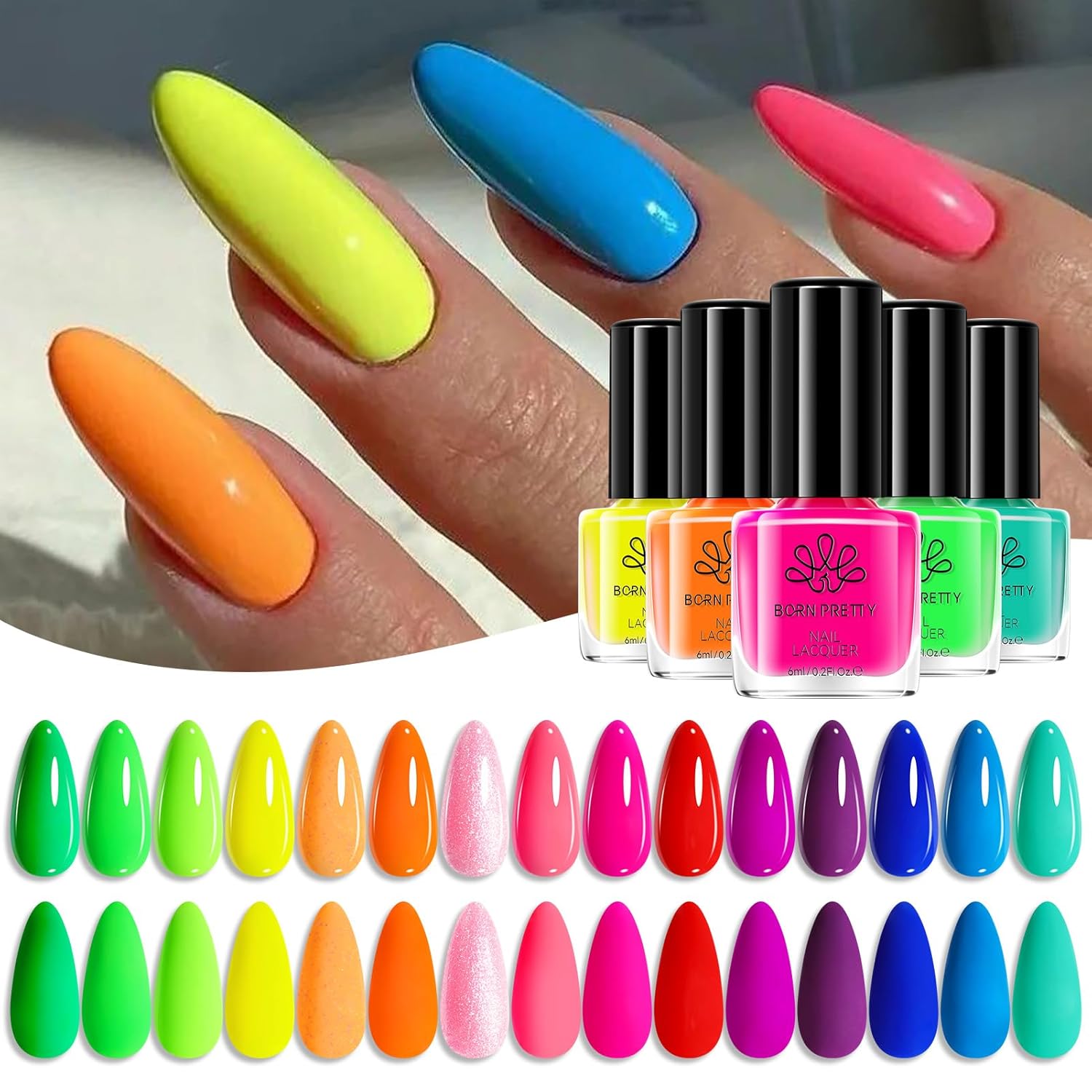 - NAIL POLISH SET: BORN PRETTY 15 Colors neon nail polish set contains 15 different hot neon colors. This quick dry nail polish kit is ideal gifts for Halloween Valentine's Day, Birthday. Perfect Gift for Daughter, Sister, Wife & Friends.