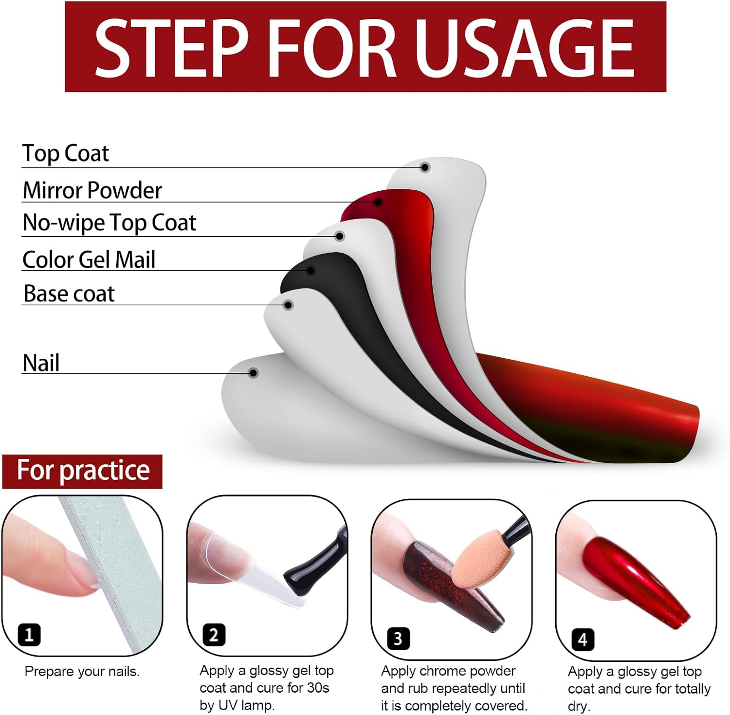 • 【The Scope Of Application】:All chrome powders should only be applied to glossy No wipe top coat to embellish Nail-Polishes color. Otherwise it is unusable, it can't be applied directly to the nail, and it can't be applied directly to the skin. Artdone chrome powder can be applied on UV gel nails, acrylic nails or false nail tips. You can use them very easily