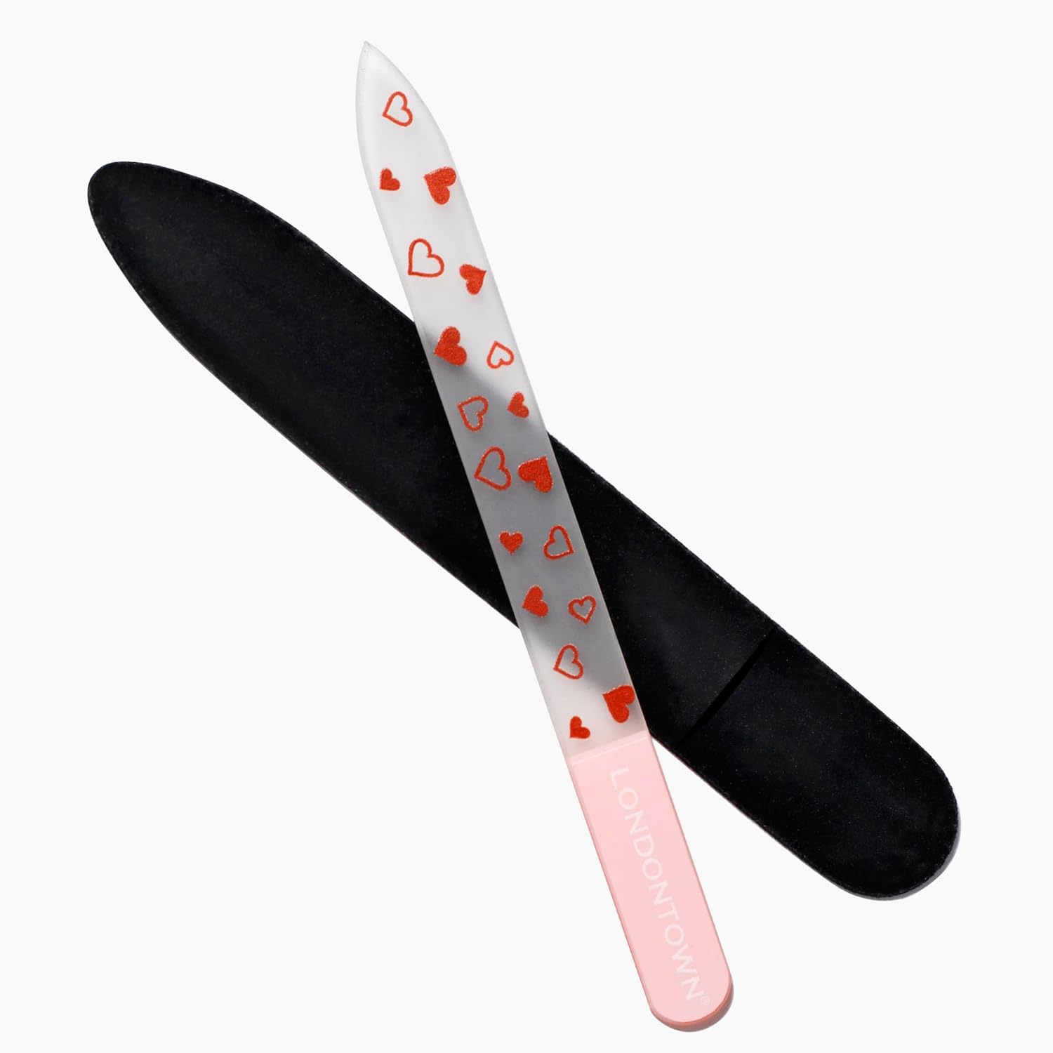 LONDONTOWN Hearts Double-Sided Glass Nail File & Care Tool, Professional Grit Etched Crystal Manicure Accessory with Case Pouch