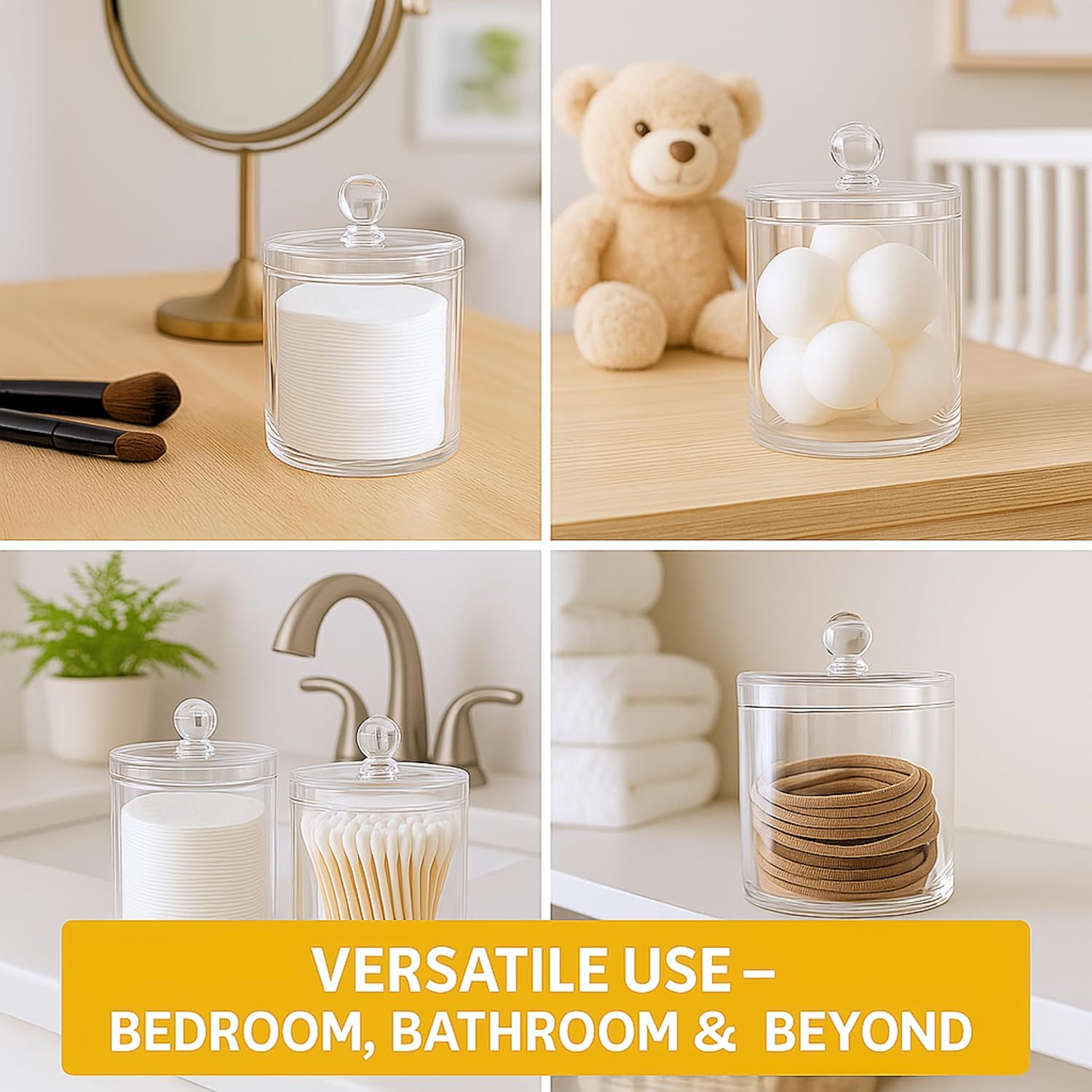 - MORE DROP-RESISTANT THAN GLASS: Acrylic storage containers smooth edges provide a secure grip and it also makes the Apothecary jar with lids more beautiful. qtip cotton ball organizers and storage crystal-clear design bathroom containers with lids enhances visibility and makes it easy to locate items. q tip holder for bathroom are crafted from high-quality, ensuring durability and safety.