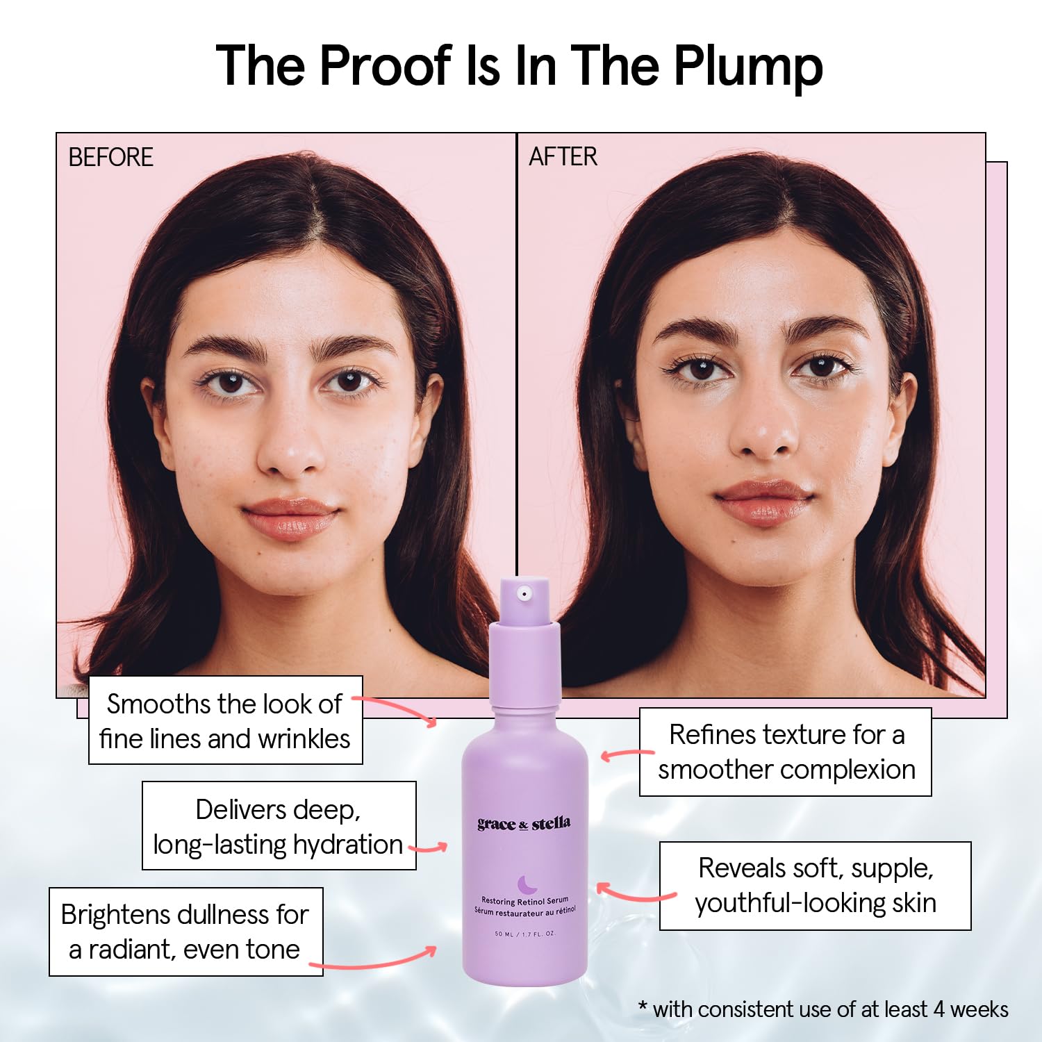 grace & stella Retinol Serum for Face with Hyaluronic Acid (50ml/1.7 fl oz) - Restoring Retinol Hyaluronic Acid Serum for Face to Reduce Fine Lines & Wrinkles - Acido Hialuronico - Vegan Skincare
