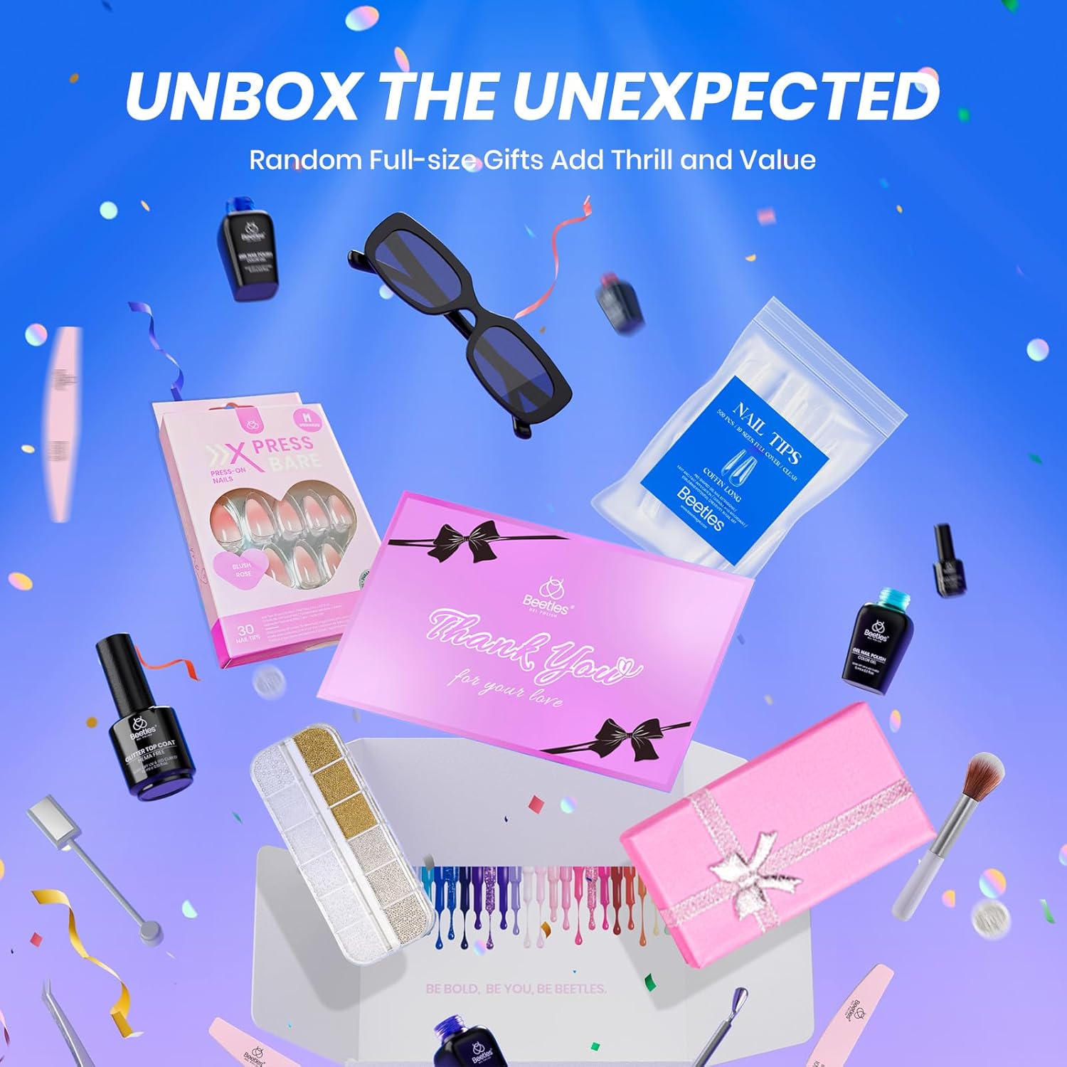 - ăSurprise Gift Box for Youă By purchasing this set, you will also receive Beetles limited time gift box, which includes sunglasses, false nail tips, nail decors, press on nails and so on. These gifts are not only practical, but also add more fun and possibilities to your nail art experience.Truly achieving "buy more" and getting better value for money.