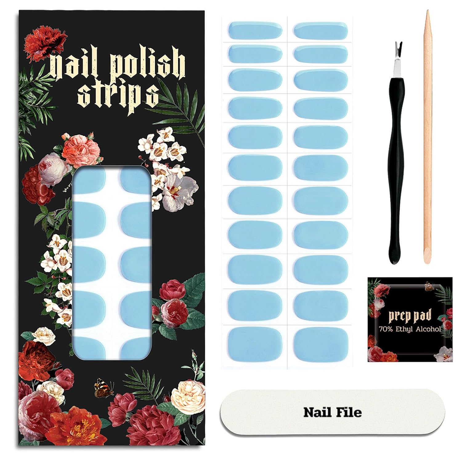 - Comprehensive Nail Wraps Set - The package includes 22 pieces gel nail stickers, 1 nail sizing kit for quick selection, 2 cleansing wipes, 1 cuticle trimmer, 1 wooden stick, 1 nail file, and an instruction manual, providing everything you need for a flawless nail experience. Each nail sheets includes 11 different sizes options to choose from, suitable for all nail sizes and shapes.