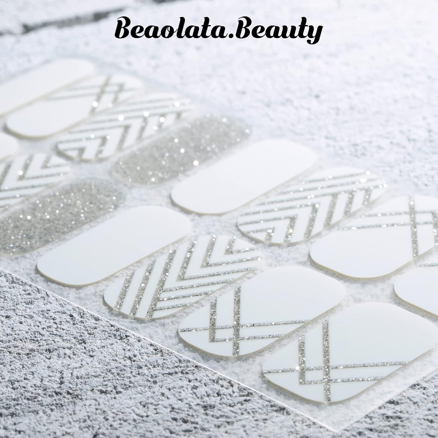 Nail Polish Strips, 32PCS Salon Quality Wraps, Long Lasting Gel Nail Stickers for Women Easy Apply& Remove (Silver&line)