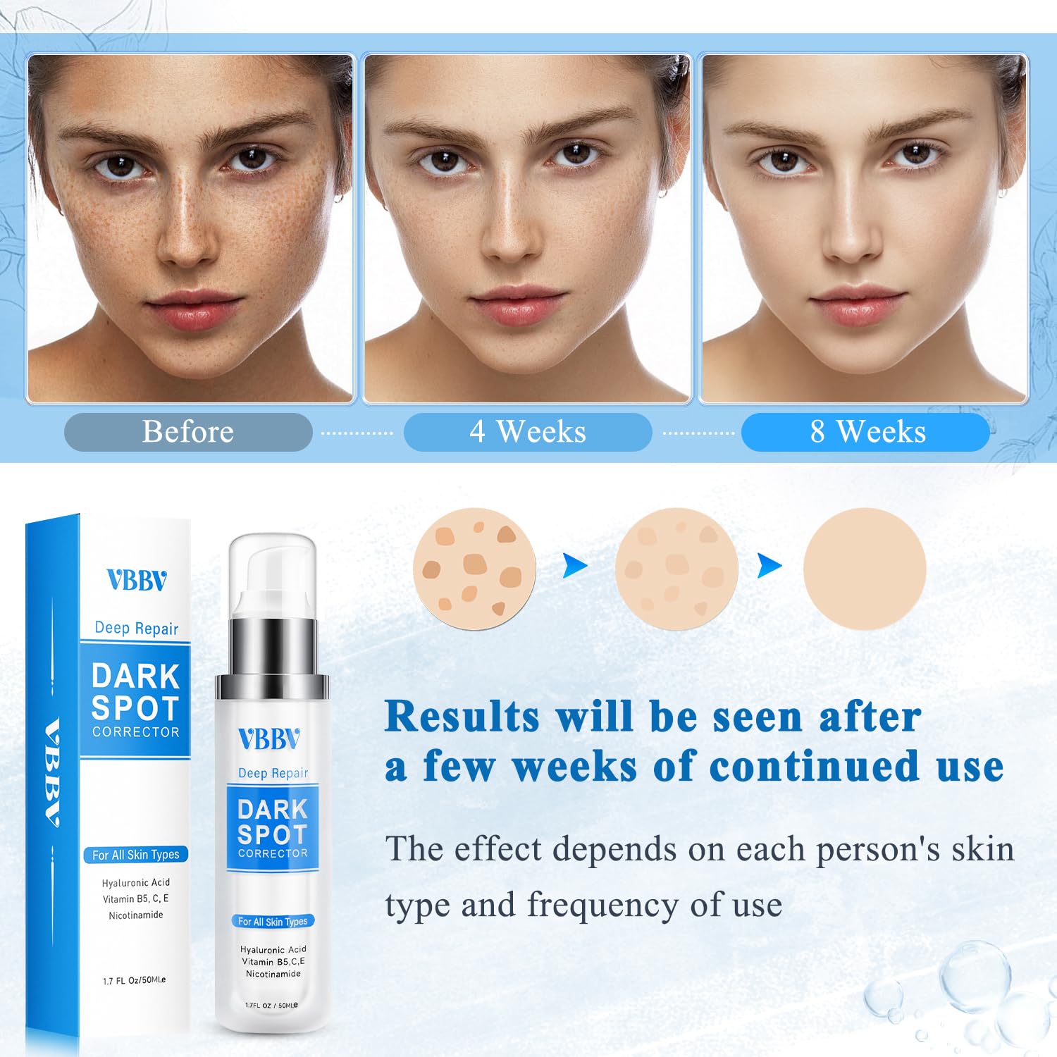 • Fast Results: Incorporate this dark spot remover for face into your daily skincare routine, use it every morning and evening after cleansing, and insist on daily sun protection. You will see visible results in 4-8 weeks, with reduced dark spots and more radiant skin