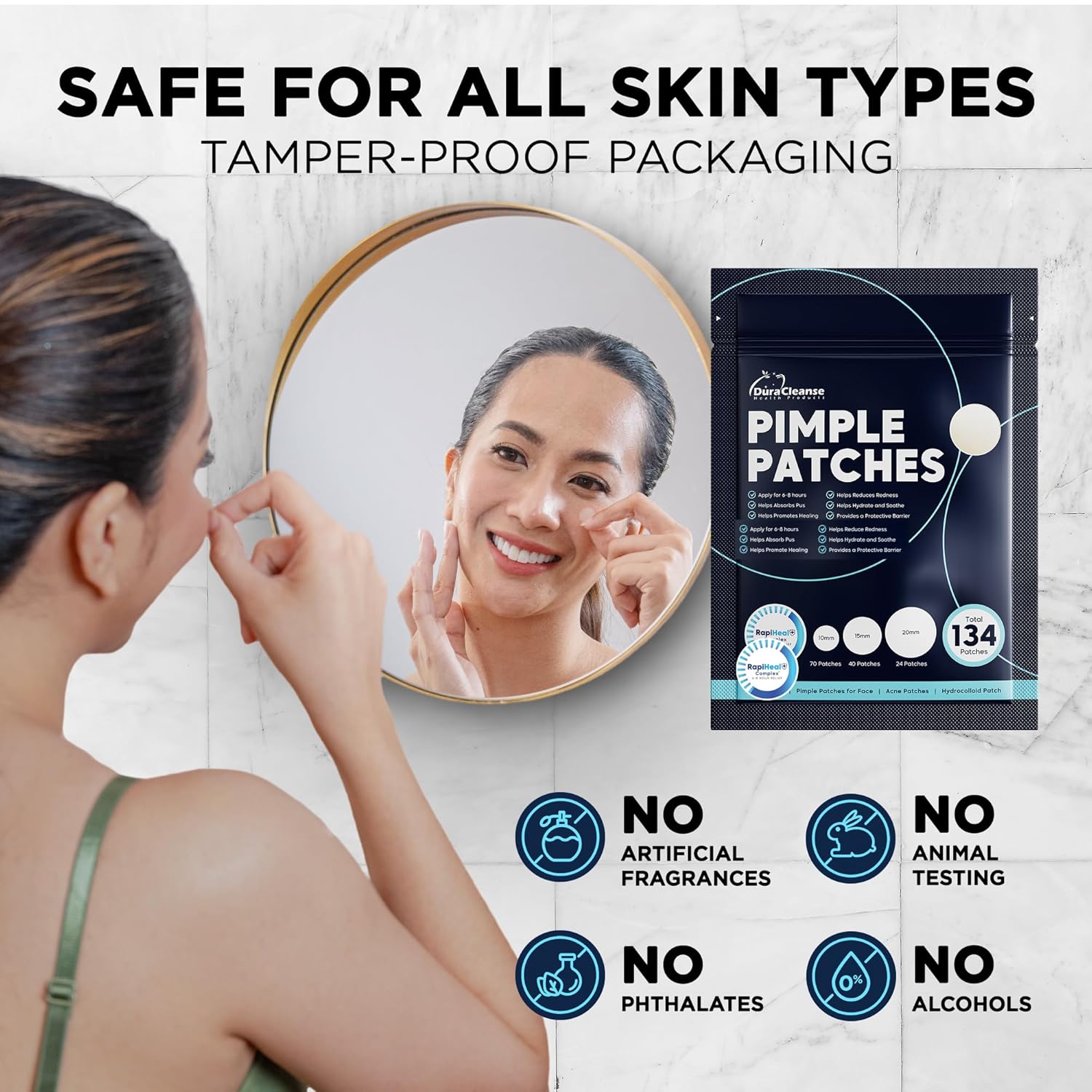 - Fast-Acting Hydrocolloid Patch: Say goodbye to stubborn breakouts with our Dura Cleanse Pimple Patches, designed to absorb pus, reduce redness, and flatten pimples in just 6-8 hours. These acne patches for face create the perfect healing environment, so you can wake up to visibly clearer, calmer skin.