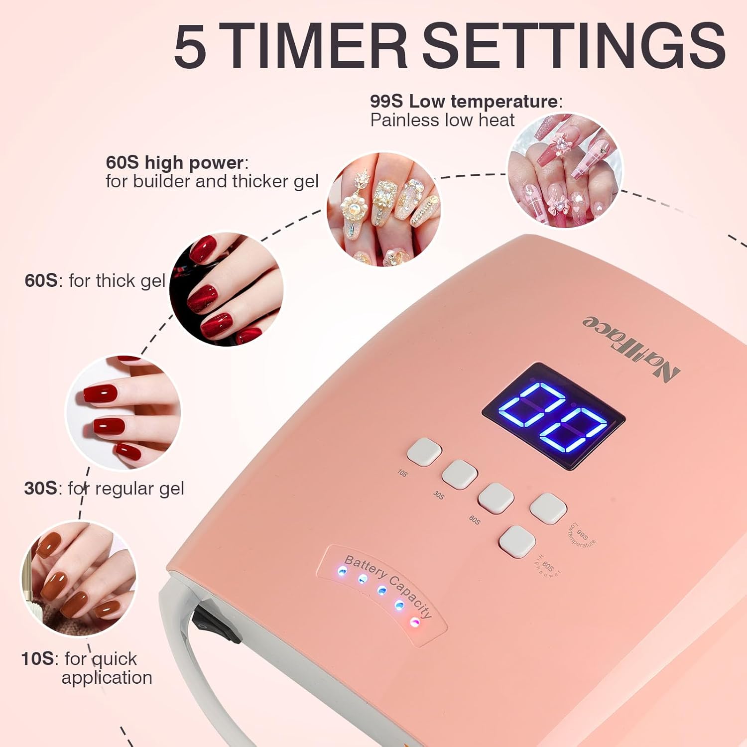 - Smart Gel Curing Lamp: Auto-sensing technology activates cordless UV nail lamp upon hand insertion; 5 settings – 10s for polish drying, 30s/60s for standard gels, 99s low-heat mode for sensitive applications; Optimized for builders and hard gels