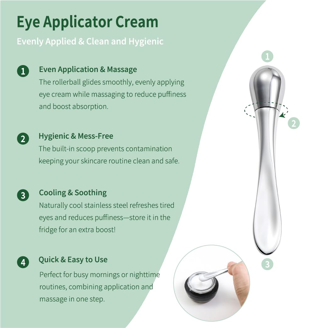 • Eye Cream Applicator: This rotating applicator rolls on the eye area, aiding cream absorption, reducing puffiness and fatigue. The tail for scooping avoids direct contact, ensuring a cleaner use.