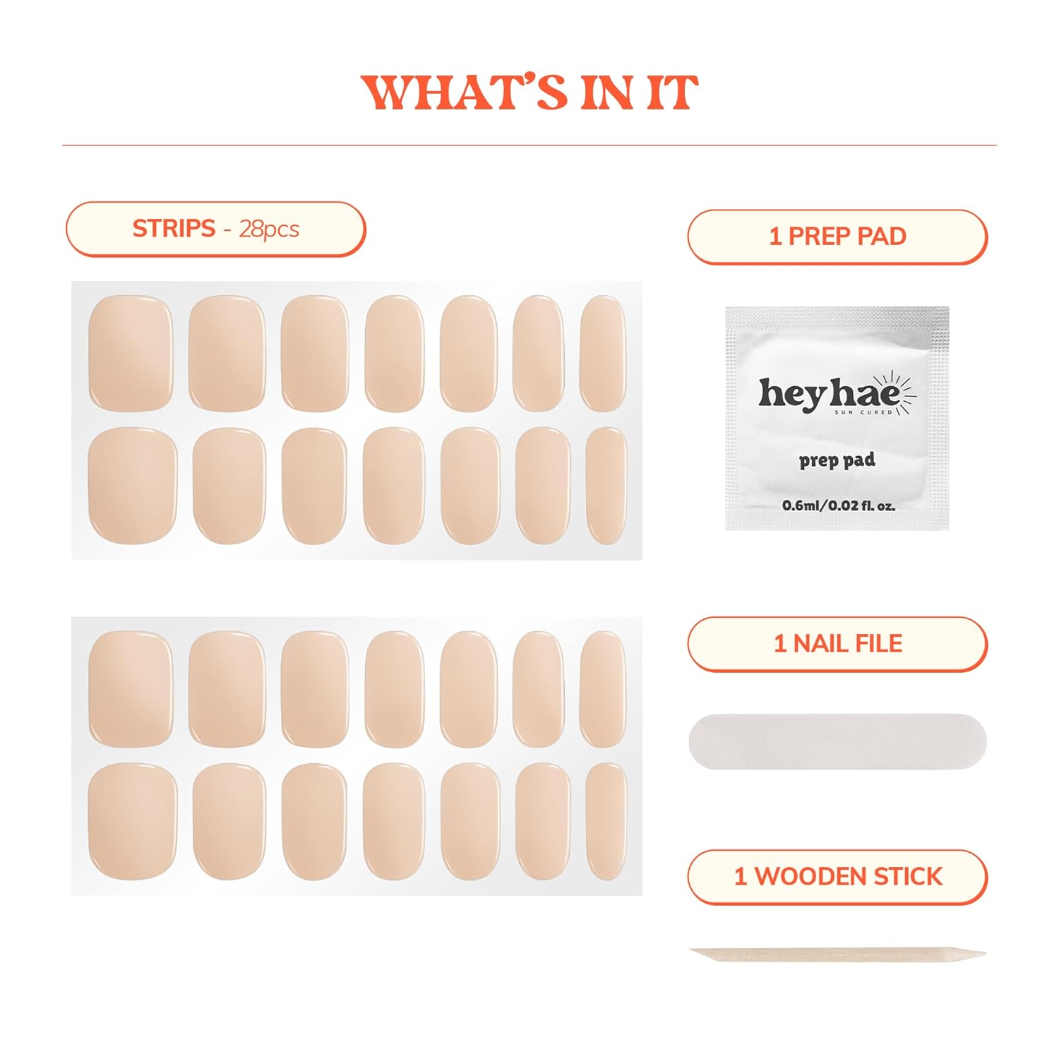 - Enjoy a complete package to get fresh salon quality nails done at ease everywhere and anywhere you go! Package includes: 28 strips, 1 Prep pad, 1 Nail file, & 1 Wooden stick.