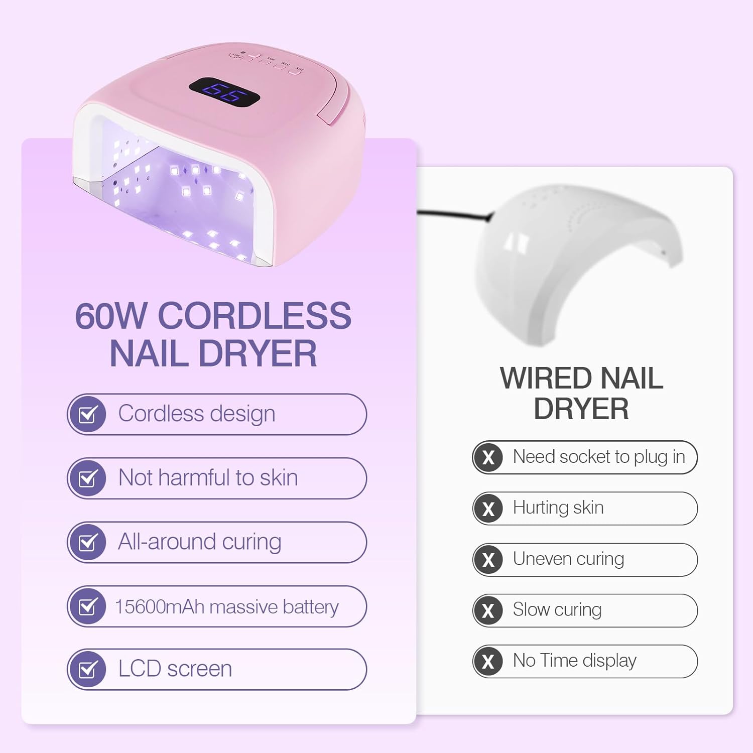 - Cordless UV Nail Lamp: Power your nail artistry with this 60W cordless gel nail lamp featuring 42 UV LED bulbs for complete coverage; Experience burn-free curing with skin-safe low-heat illumination