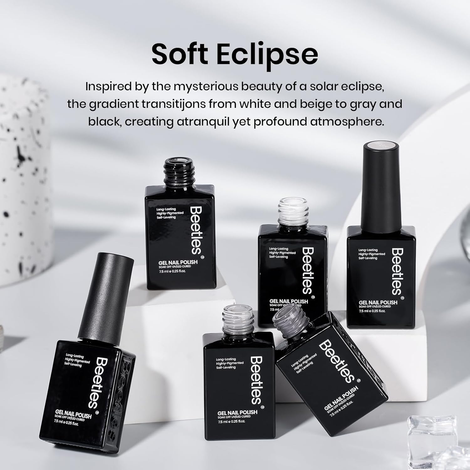 - Black White Gel Polish Kit(6*7.5ml /0.25 fl.oz ): Inspired by the mysterious beauty of a solar eclipse, the gradient transitijons from white and beige to gray and black, creating atranquil yet profound atmosphere. Color Number are: f965, f966, f967, f968, a219, a220.