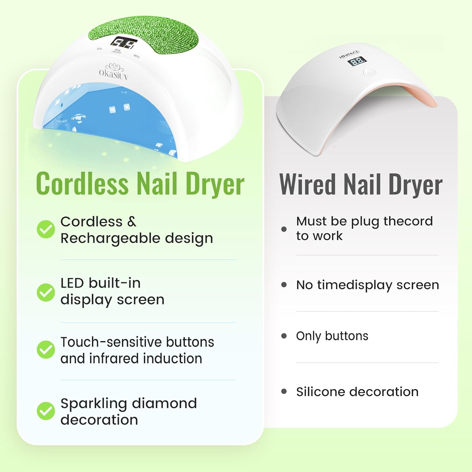 - 【Fits ALL Gel Polishes & Extensions】Okasiuv works with hard gel, polygel, dip powder, acrylics, and more. Say goodbye to undercured nails—this lamp delivers salon-perfect results every time