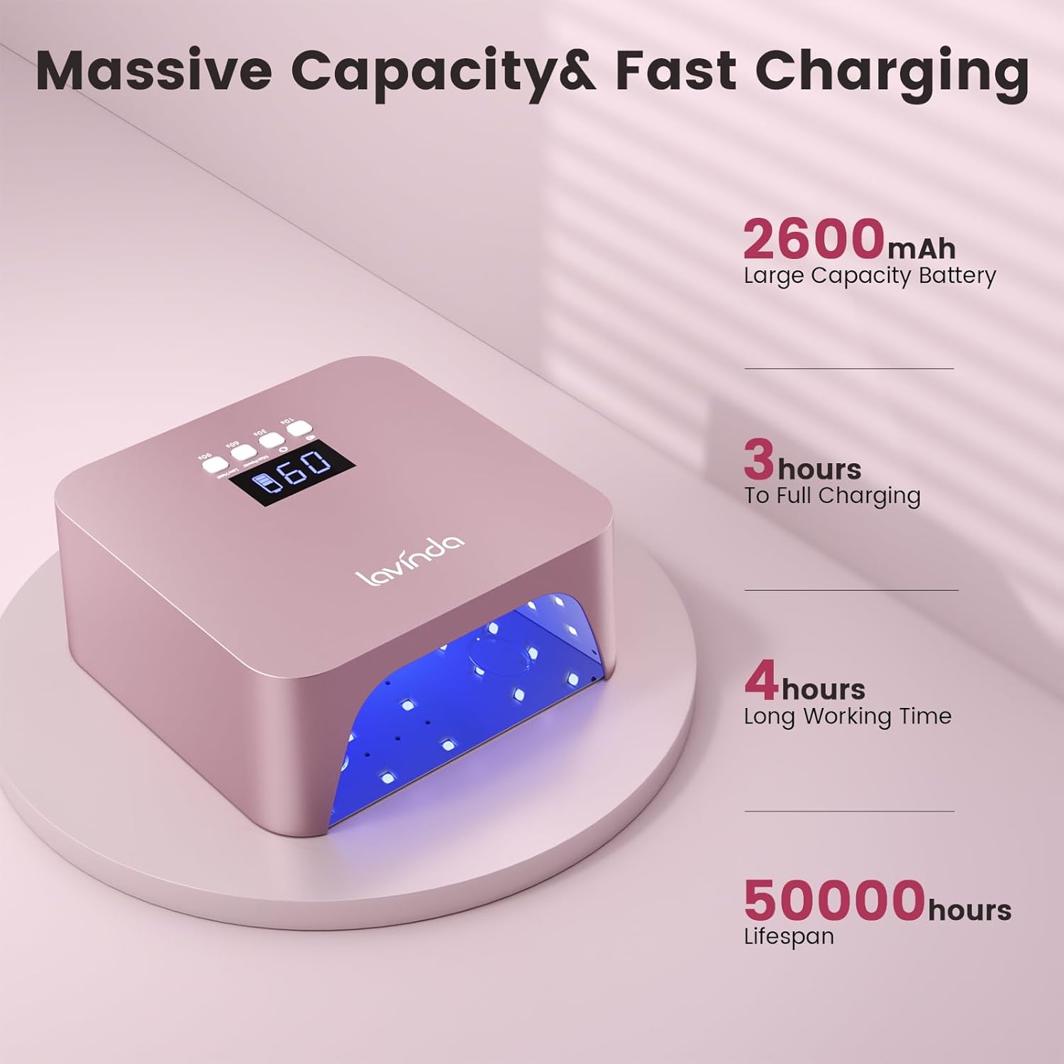 • 【Rotating Display & 2600mAh Battery】 This gel nail lamp features a digital LCD screen with 4 timer modes: 10s/30s/60s/90s. Long-press (1.5s) to seamlessly switch between low heat, mute, and screen rotation—all clearly shown on the display. Powered by a 2600mAh rechargeable battery, it delivers 3–4 hours of cordless runtime and fully charges in just 3 hours. Designed for efficiency in both salon and home use.