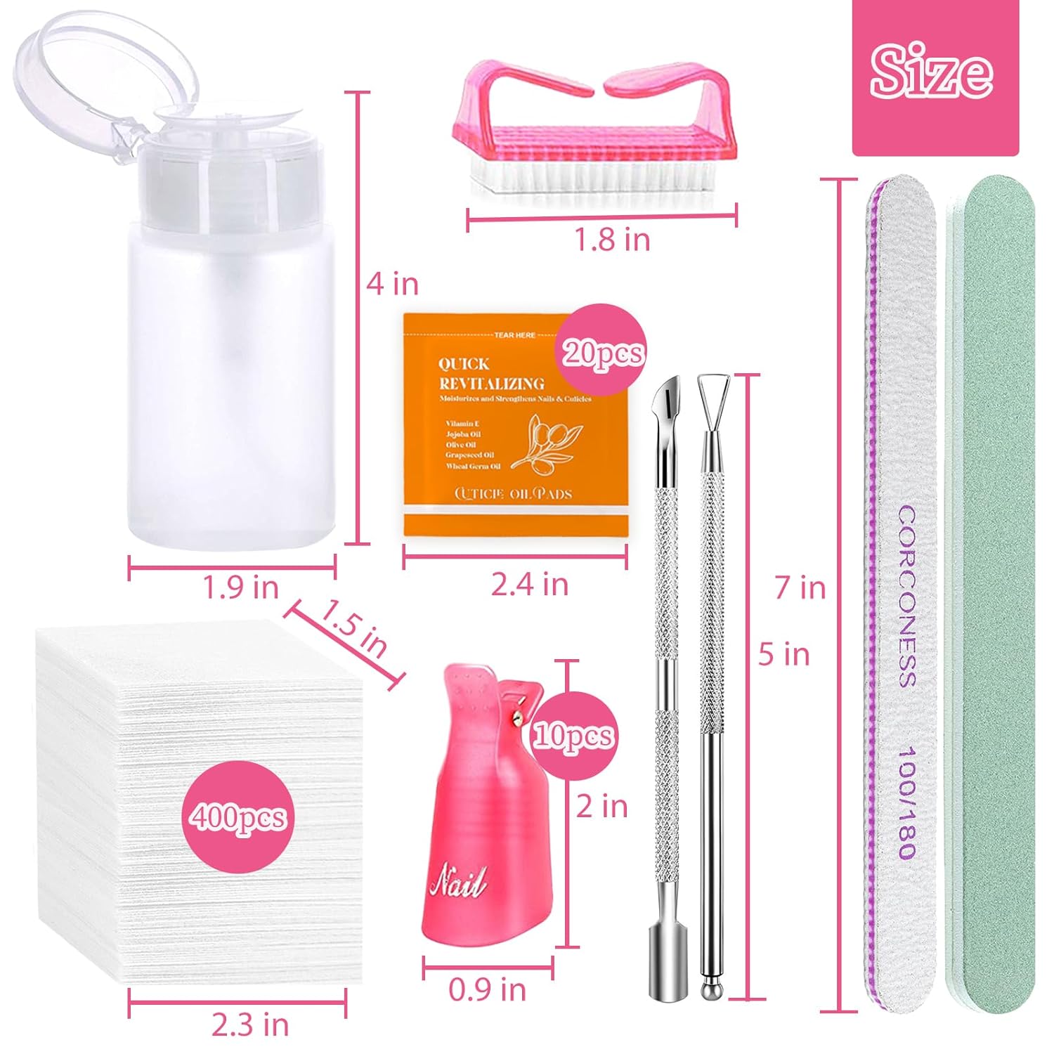 • Versatile Cuticle Care Tools: 100/180 grit nail file allow you to easily remove top coat and shape your nails to perfection. The double end cuticle pusher included is perfect for pushing back cuticles, cleaning nail dirt, and removing stubborn residue. The triangle cuticle peeler is designed to remove gel nails. Nail buffer includes two distinct grit sides for refining the nail surface and achieving a smooth, polished finish. Nail care pads can moisturize your nails and cuticles.