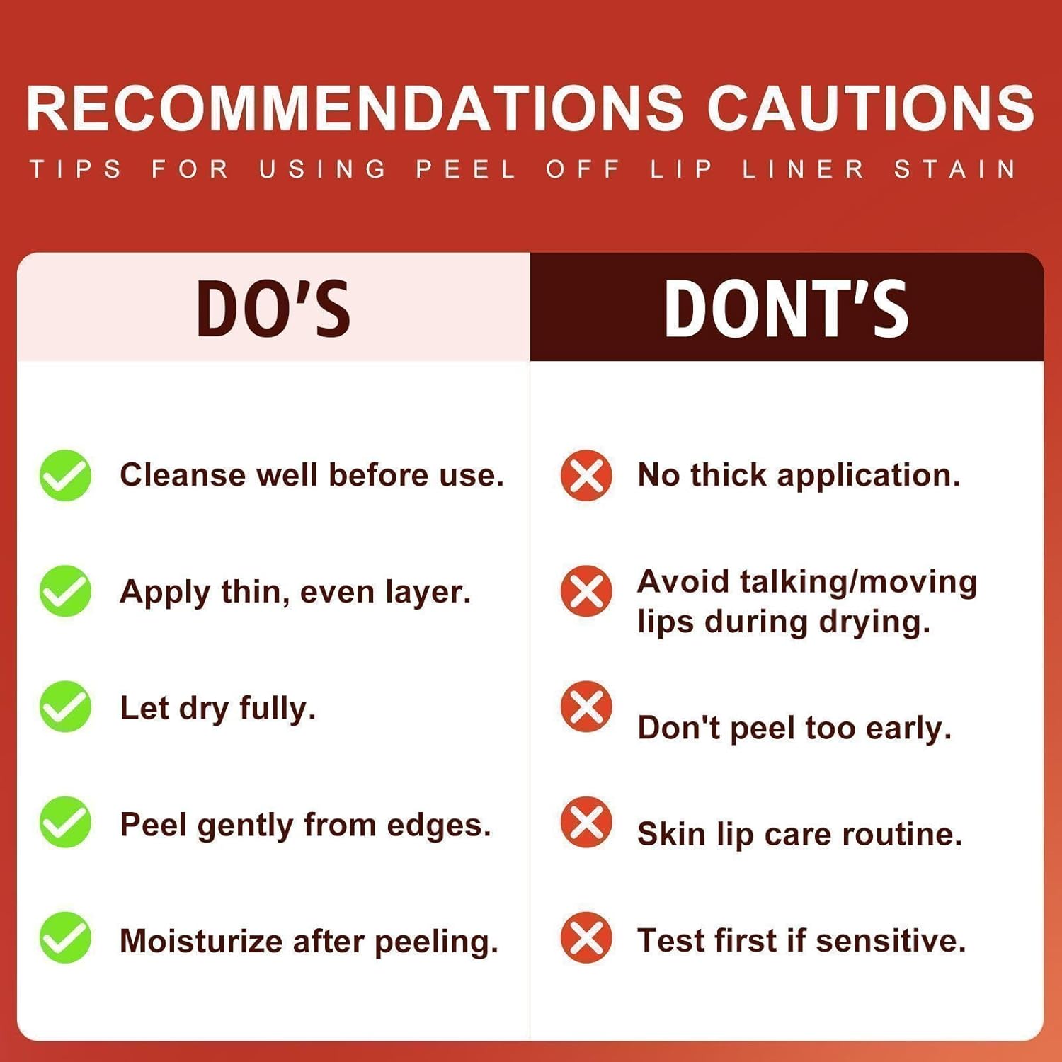 - Method of Use: First, wash and dry your lips. Lip liner stain works best on bare, clean skin (don't apply lipstick or other lip products before applying). Apply evenly along your lip line and let it sit for 20 minutes until it forms a film. Use your fingers to slowly peel off the top layer to create a moisturized lip. Finish with your favorite lip color.