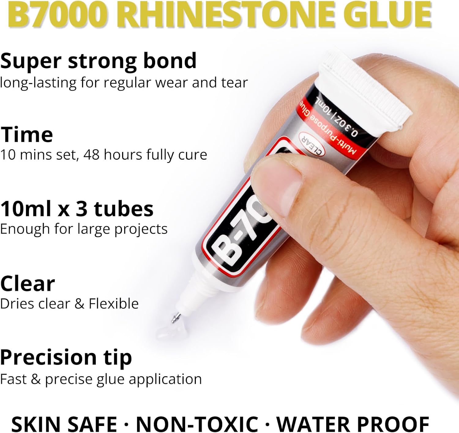 - B7000 Clear Glue for Gemstones -- B7000 glue has strong adhesion and dries clear, waterproof when dried, non-toxic and harmless to the skin. The glue has a precision needle for easy application, they can be applied precisely