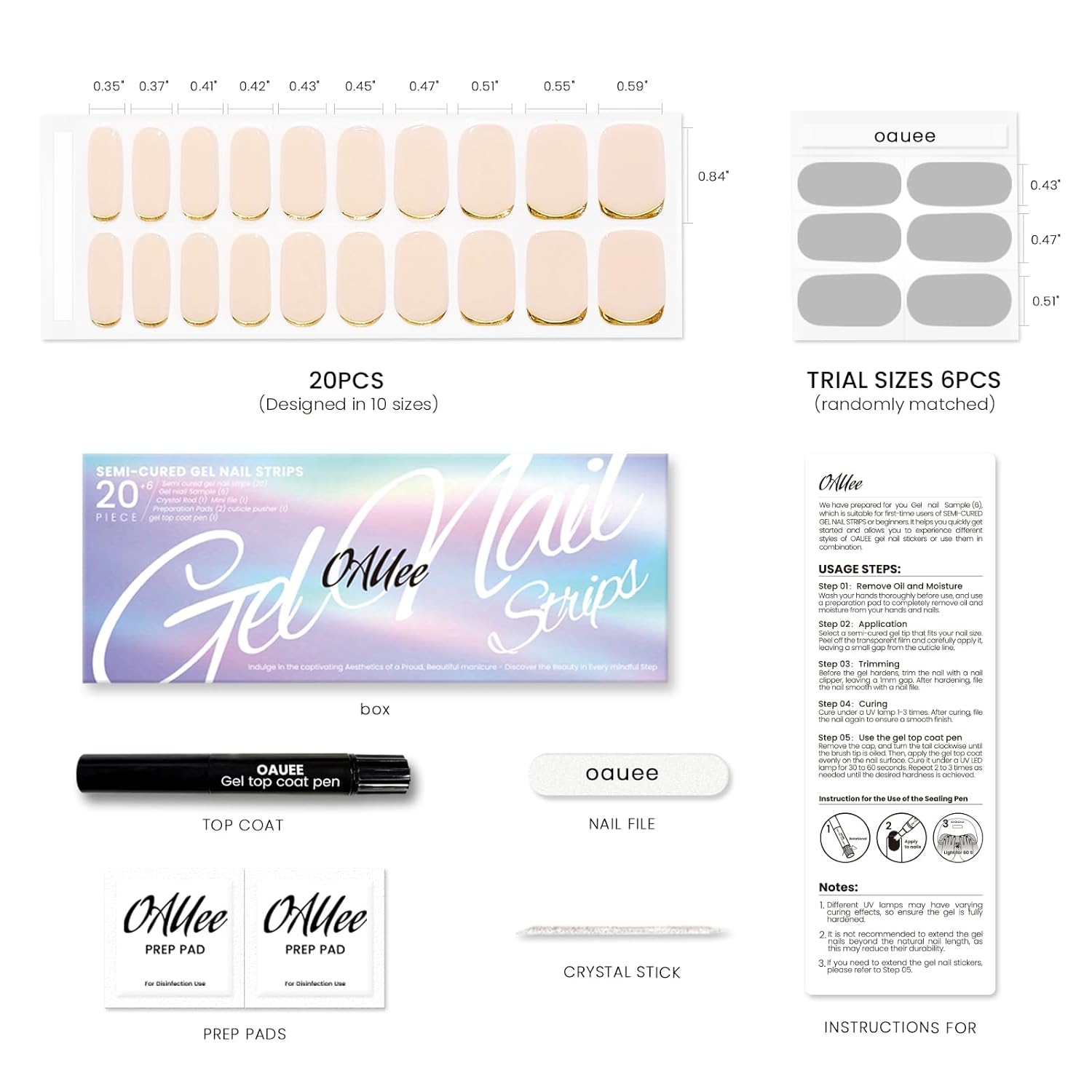 - Innovative Gel Nail Strips: Nail gel strips are made from 100% real gel nail polish ingredients, not plastic material. Through its expertise, OAUEE presents semi-curing gel nail strips, made with an innovative formula that comfortably fits all types of nail sizes and shapes and achieves a perfect aesthetic look for your nails!