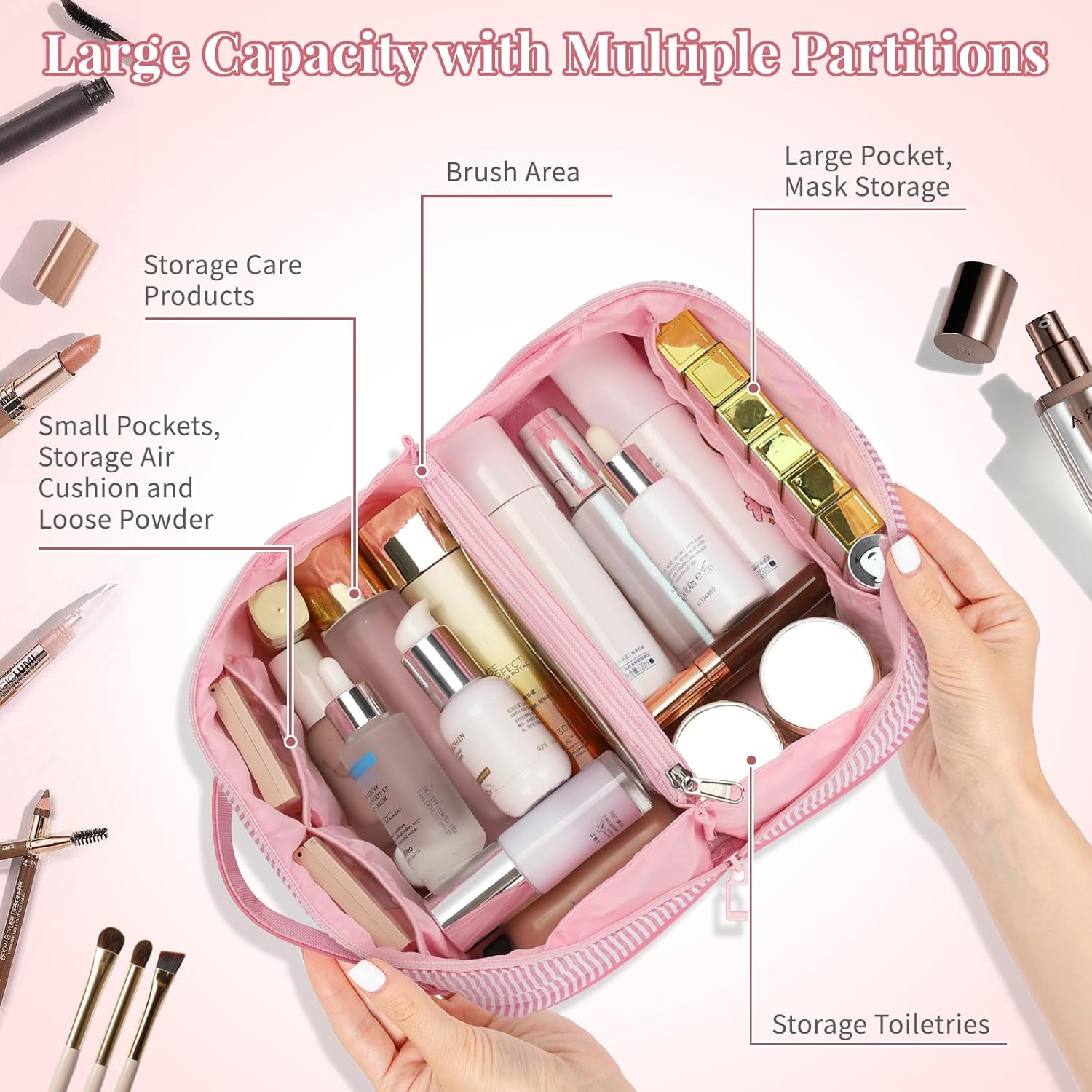- Quick Access Design - Portable 180Β°wide-open flat makeup bag with different sized pockets and 2 main compartments, 1 clear pocket for integrated storage of cosmetics, brushes and skin care. No more digging - Effortlessly get all makeup elements right away.
