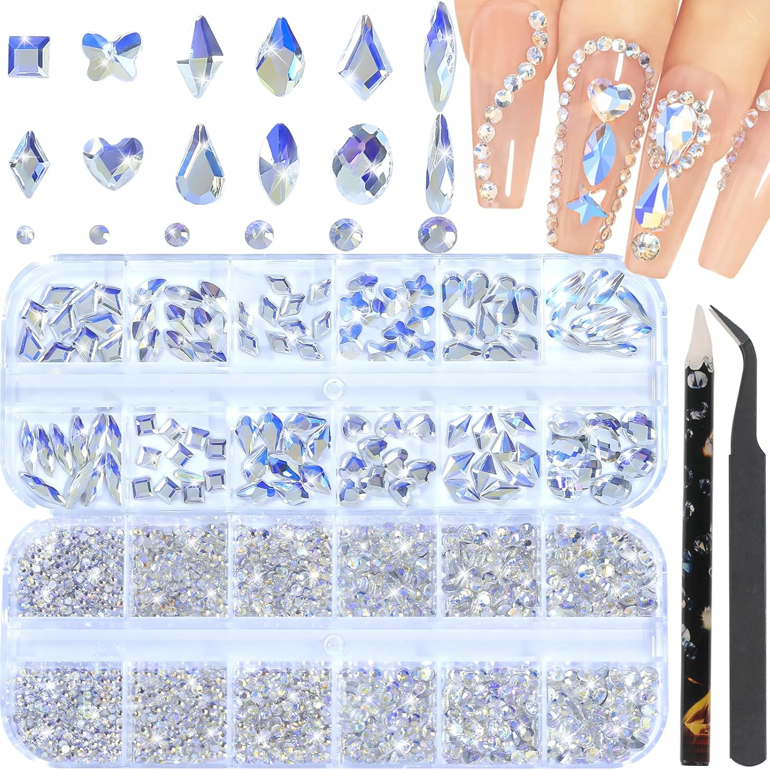 Nail Rhinestones - 3D Multi Shape Size, Flat Back, Manicure Rhinestones Charms, Crystal Moonlight Blue Gems, with Kit, for Nail Art, Bedazzling Acrylic Nails, DIY Decor
