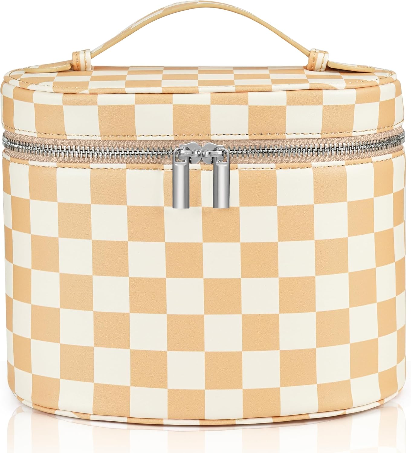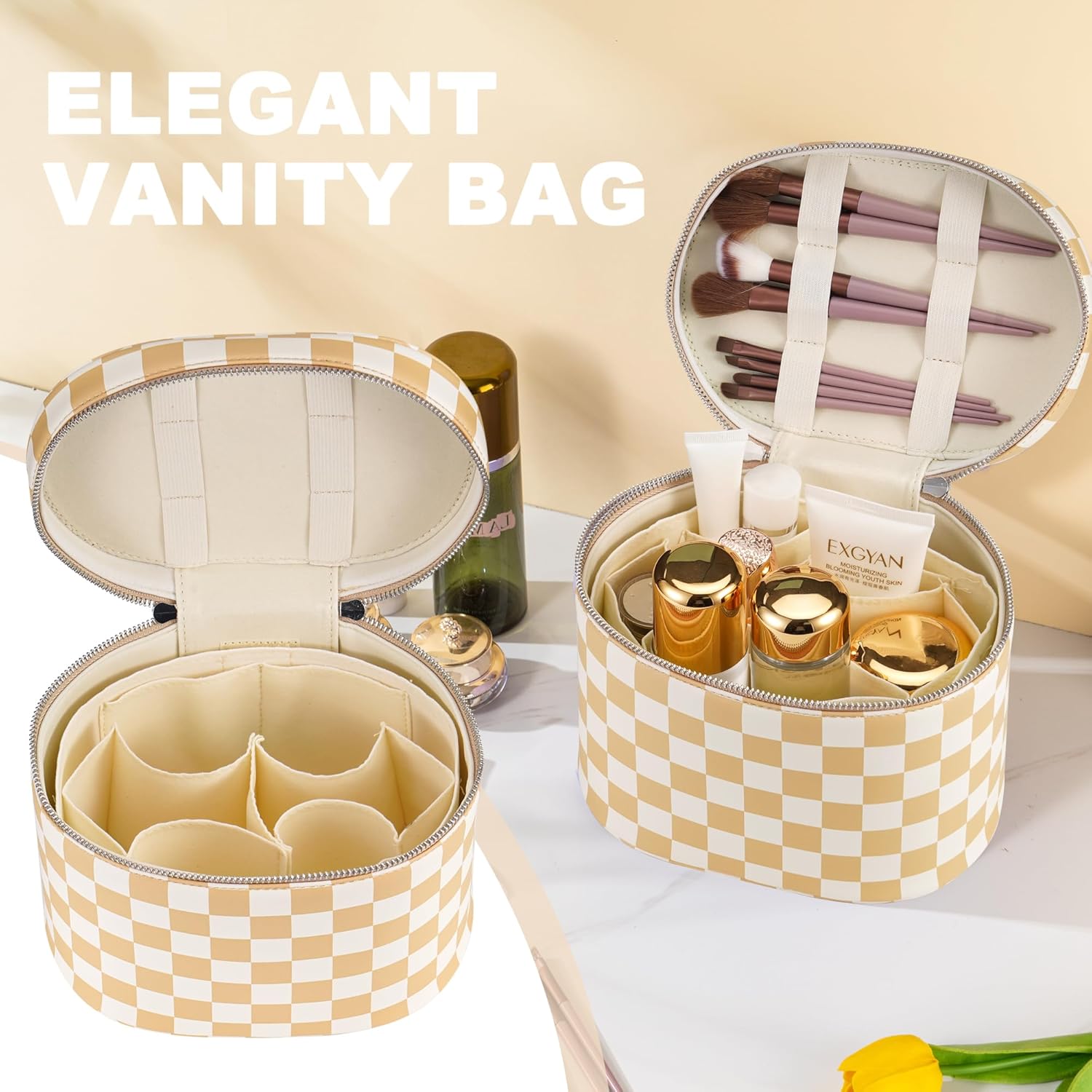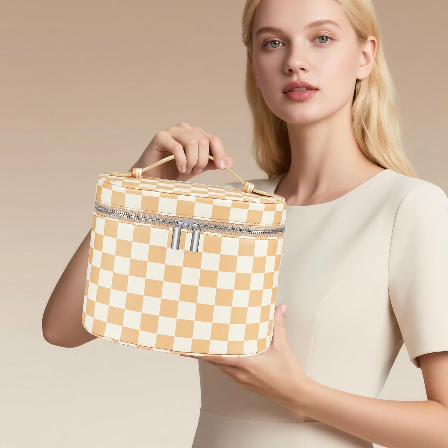 Makeup Bag Vanity Case Cosmetic Bag with Removable Divider Travel Toiletry Bag for Women Portable Make up Box Organizer, Beige and White