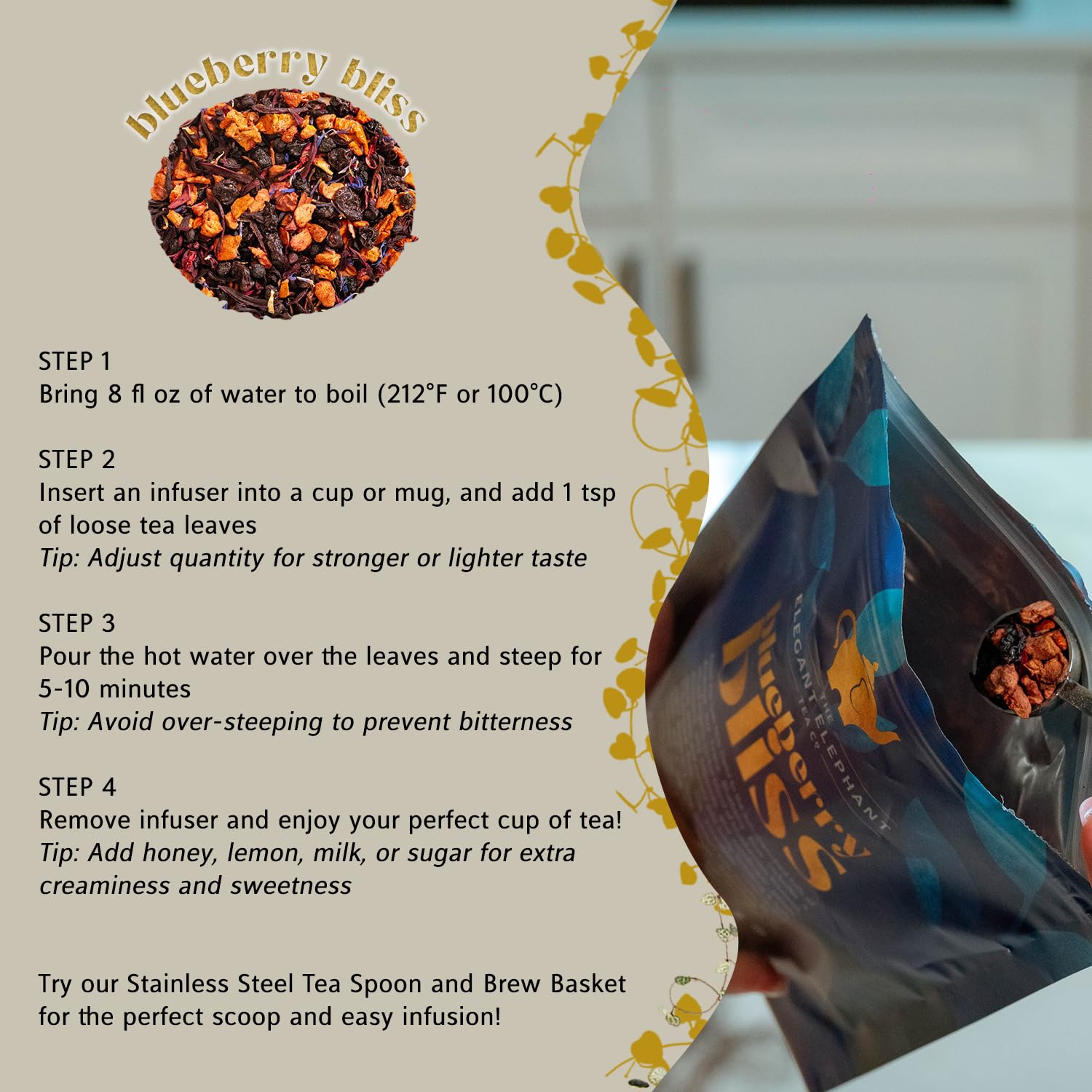 - BRIGHT BLUEBERRY BLISS: Juicy blueberry blends with hibiscus, elderberry, apple and more in this antioxidant-rich, fruity herbal tea.