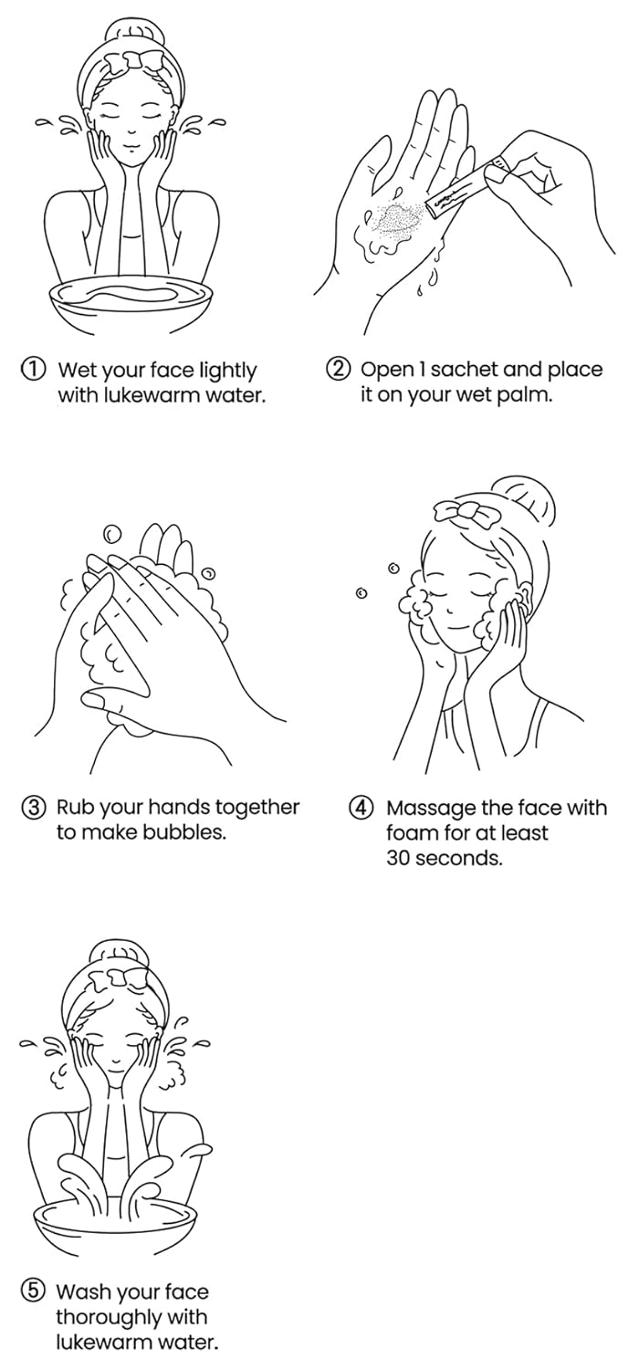 - How to Use: Wet your face with lukewarm water → Dispense the contents of one sachet onto wet hands and rub to create a lather(Add a small amount of water if needed to build foam) → Gently massage the foam onto your face for about 30 seconds(This allows the active ingredients to work effectively) → Rinse thoroughly with lukewarm water
