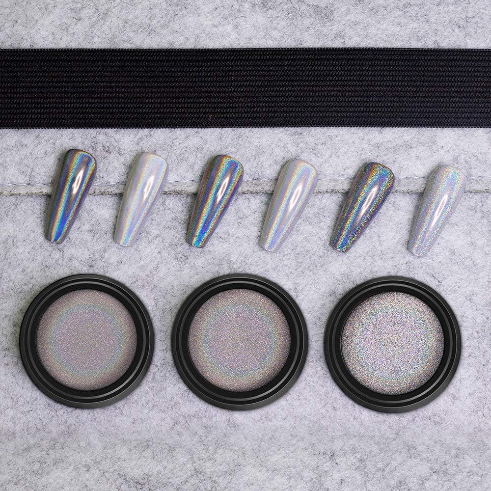 - PACKAGE CONTENTS: 3 jars different size holo powder, It needs to be used with gel nail polish and no wipe top coat. They can make many different design for your gel nail polish. It gives different color base a pearly shine for your nails