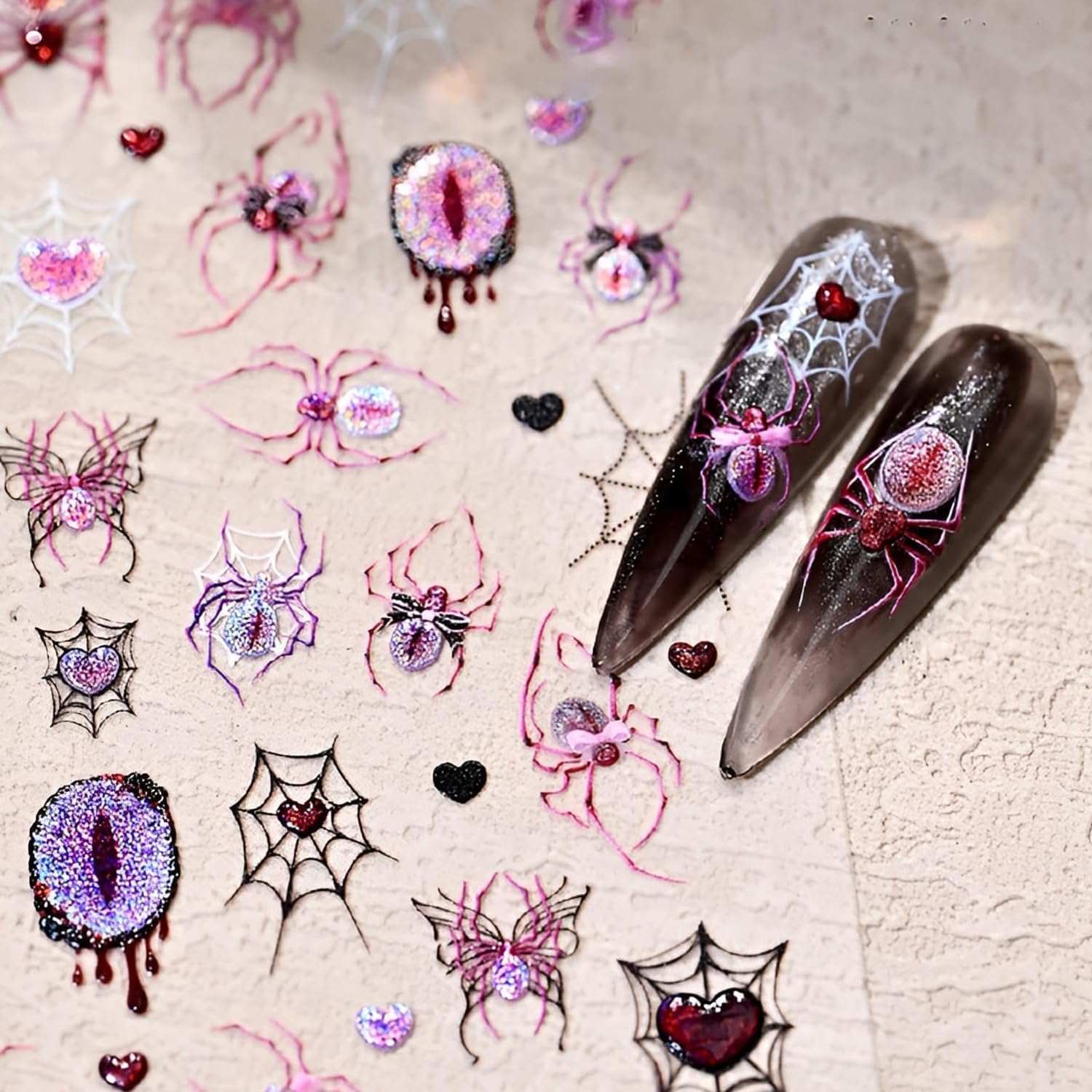 2 Sheets Halloween Nail Art Stickers Decals 5D Embossed Spider Web Nail Decals Glitter Spider Eyes Nail Design Stickers Gothic Halloween Nail Art Supplies for Women DIY Manicure Decoration Accessories