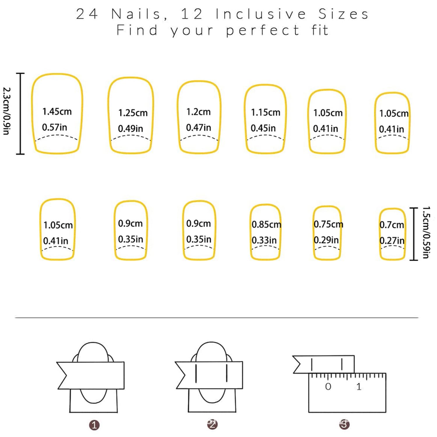 • Package: You'll get 24 fall fake nails in 12 sizes. 1 mini nail file, 1 small wooden stick, 1 piece of adhesive tab glue. You can safely choose a fake nail that fits your finger size and DIY your desired nail shape