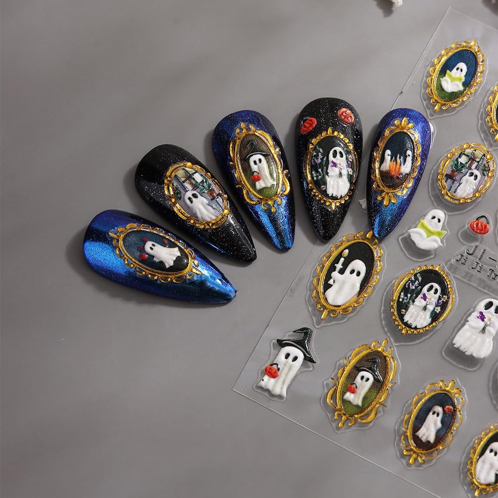 Halloween Nails Stickers White Ghost Nails Sticker 5D Embossed Cute Ghost with Gold Frame Self Adhesive Sticker Nail Decals Pumpkins Nail Art Decal Halloween Decals for Nail DIY Manicure 1Sheet