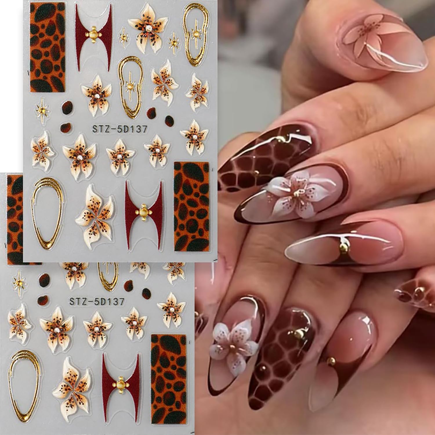 Fall Nail Stickers Leopard Flower Nail Decals Autumn Nail Art Supplies 5D Embossed Self Adhesive Leopard Print Floral Nail Design Supplies Brown Fall Stickers for Women DIY French Manicure Accessories